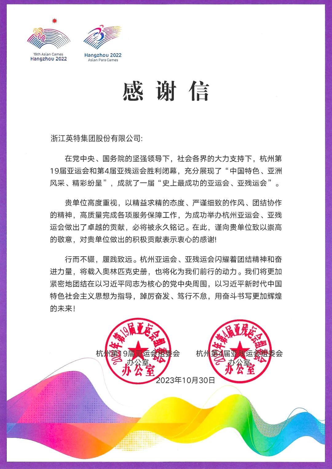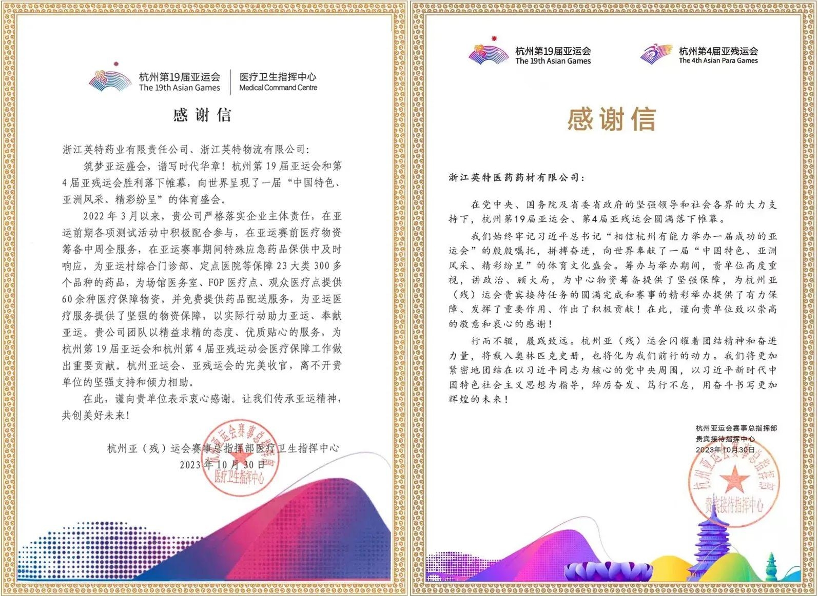 日前,杭州第19屆亞運(yùn)會(huì)組委會(huì)、杭州第4屆殘運(yùn)會(huì)組委會(huì)向英特集團(tuán)發(fā)來感謝信,對英特為成功舉辦杭州亞運(yùn)會(huì)、亞殘運(yùn)會(huì)做出的積極貢獻(xiàn)表示衷心的感謝。同時(shí),英特藥業(yè)、英特物流和英特藥材等公司也獲得杭州亞(殘)運(yùn)會(huì)賽事總指揮部醫(yī)療衛(wèi)生指揮中心、貴賓接待指揮中心的感謝與肯定。